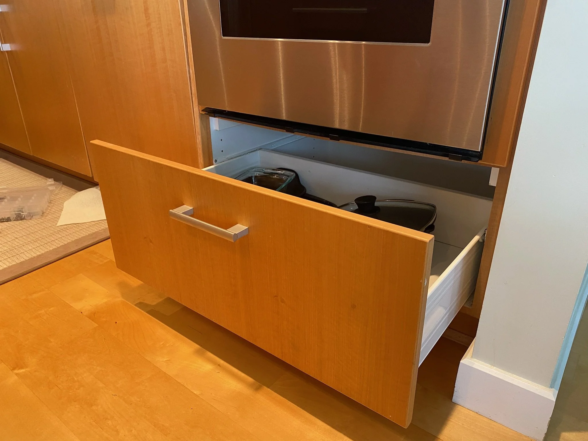 Kitchen cabinet drawer repair after the cabinet front fell off during use.